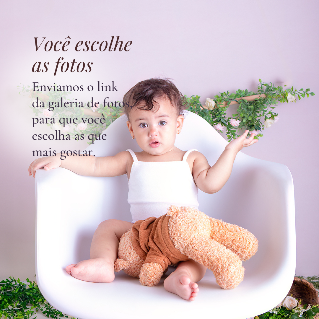 * Gostou de outras fotos, além das contratadas no seu pacote? Não tem problema. Você poderá escolher no momento da seleção das imagens. Os valores serão informados no momento do envio das fotos para seleção.